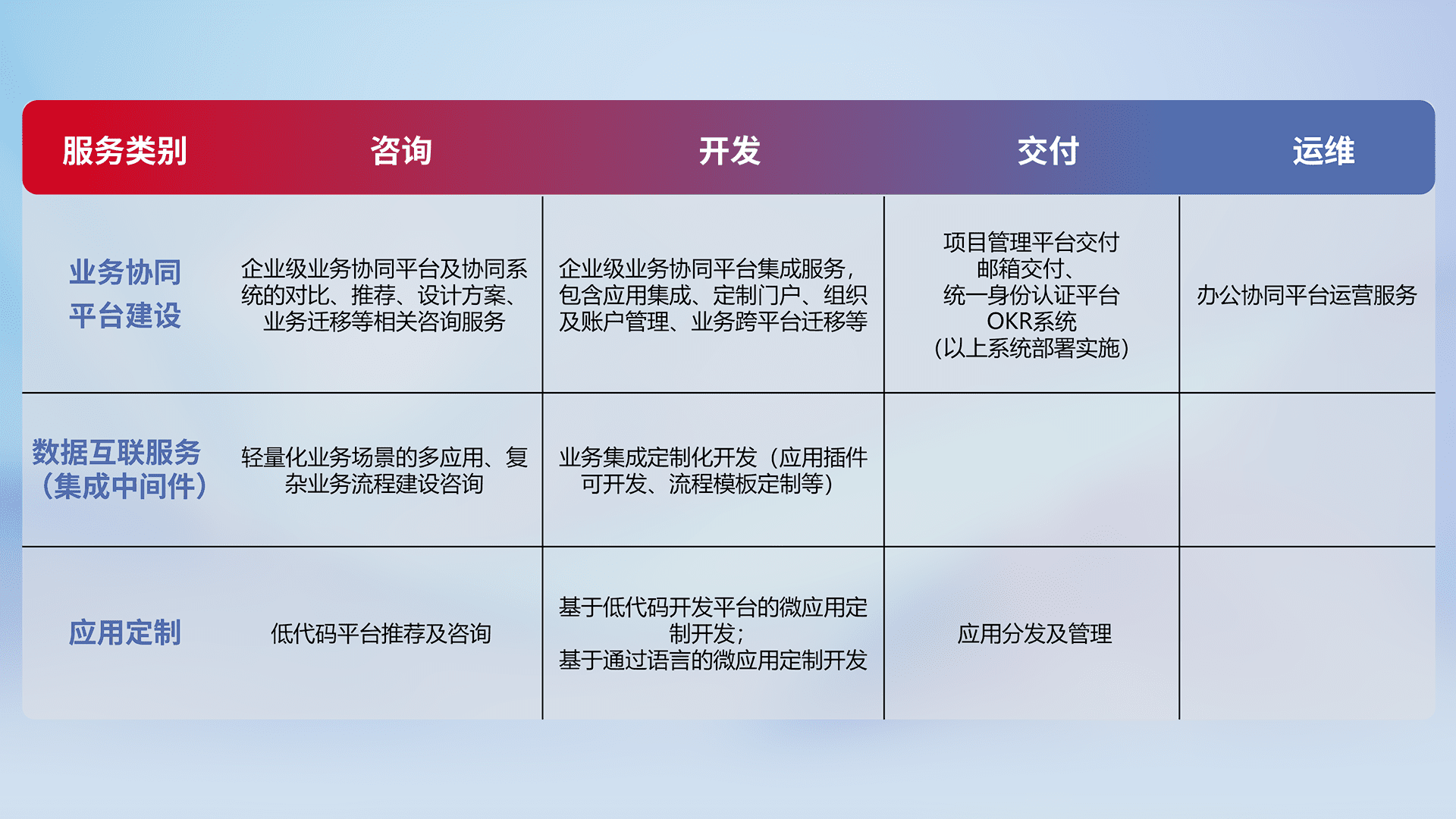 针对钉钉、、、、企微、、、IDaas等平台级产品提供产品的规划、、、、方案、、交付、、定制化开发等服务,,,实现如统一协同办公、、智能客户服务、、、混合会议管理、、智能数据查询、、等业务场景,,,,实现数字化转型。。。。