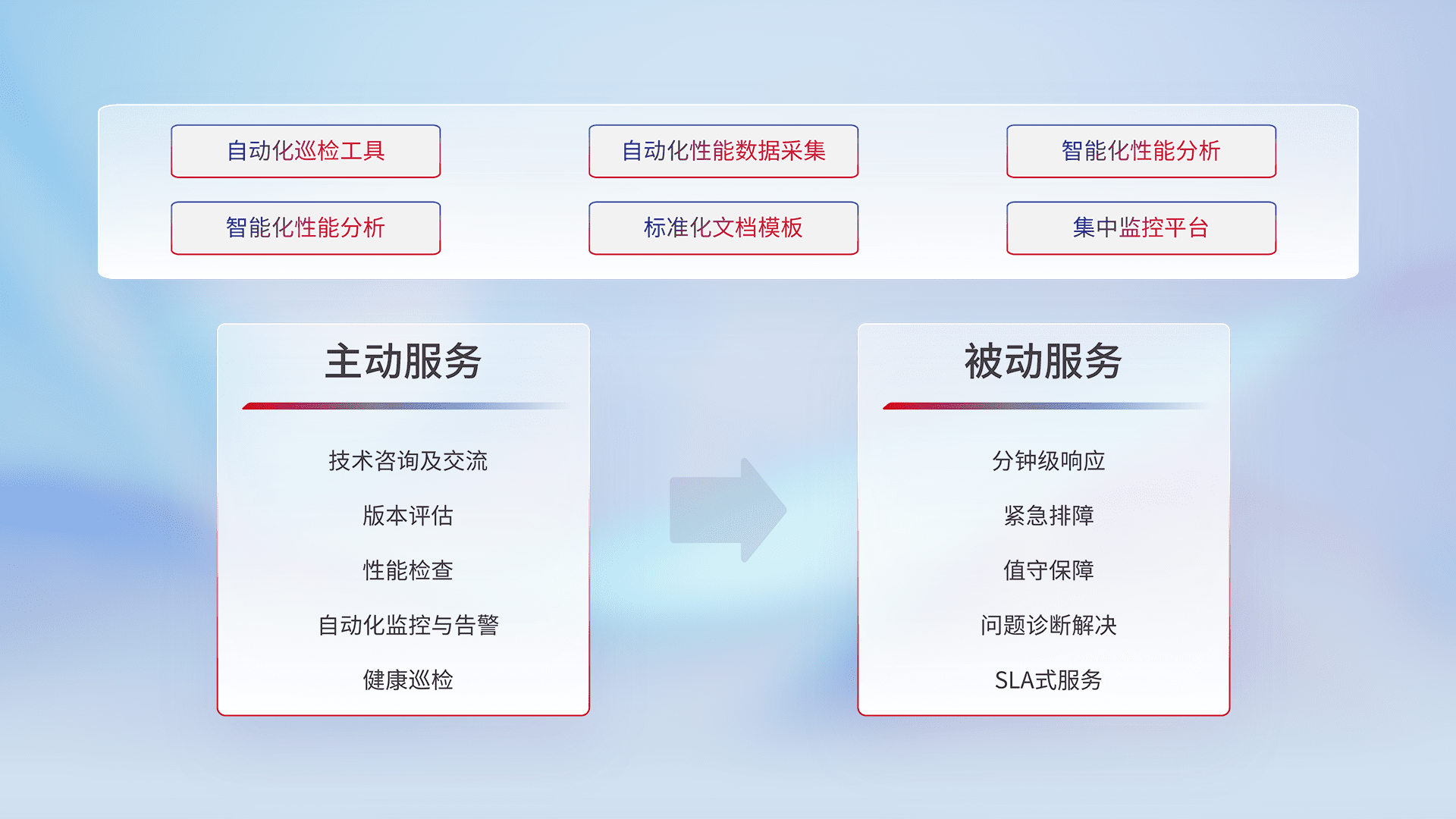 智能化工具和标准化文档,,,,保障服务质量,,,,提供主动服务(包含技术咨询、、、版本评估、、性能检查、、、自动化监控与告警、、健康巡检)和被动服务包含(分钟级响应、、、紧急排障、、、、值守保障、、问题诊断解决、、、SLA服务)。。