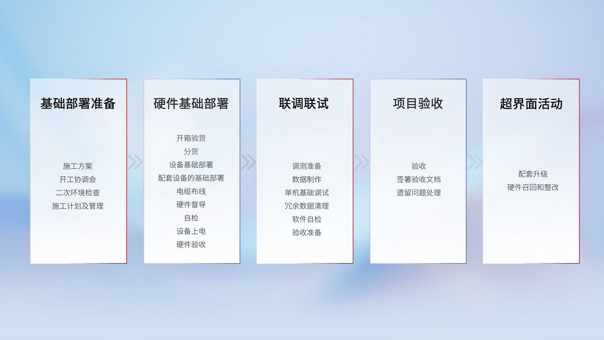 从基础部署准备、、硬件基础部署、、联调联试、、、项目验收、、、越界面活动的全过程可追溯,,,保证施工质量和进度。。。